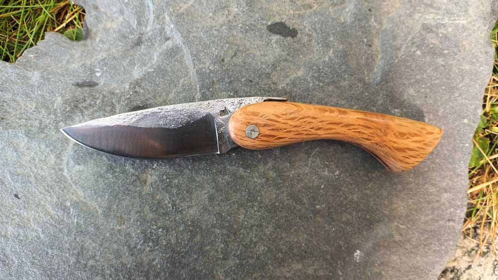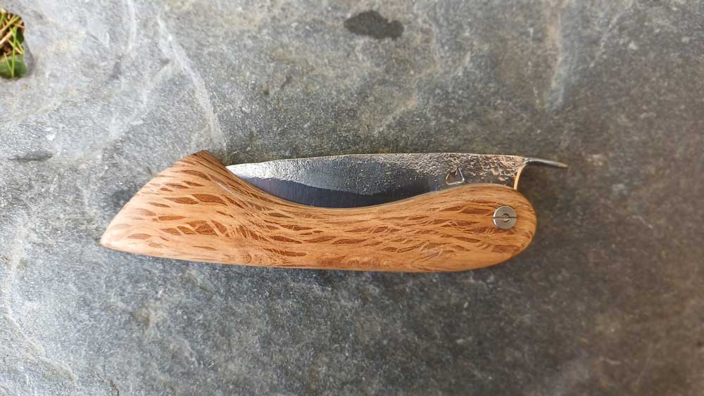 Lame forgée dans l’acier carbone XC75/DNH7 8cm Manche sculpté dans le chêne vert stabilisé