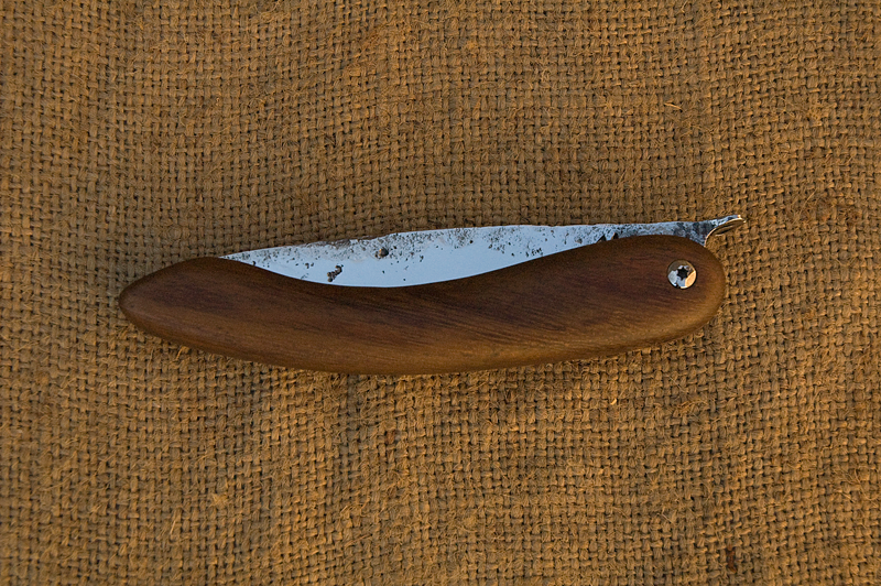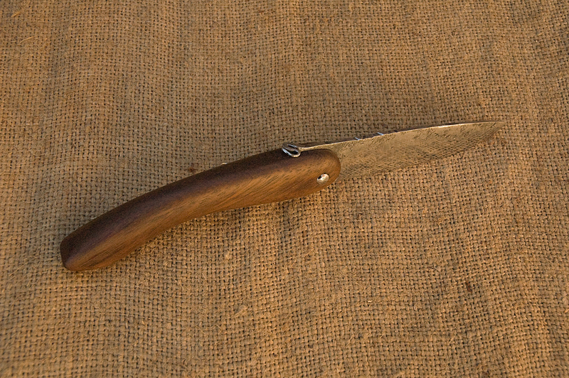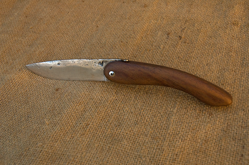 VENDU – Ce couteau de poche sobriété et élégance. La lame forgée dans l’acier au carbone porte encore les marques de la forge. Son manche ergonomique, en bois intégral, offre une prise en main des plus sûre. La lentille en « S » assure la butée de la lame sur le manche. Les têtes du pivot sont facétées tels des cristaux. Vendu avec un étui en cuir brut.