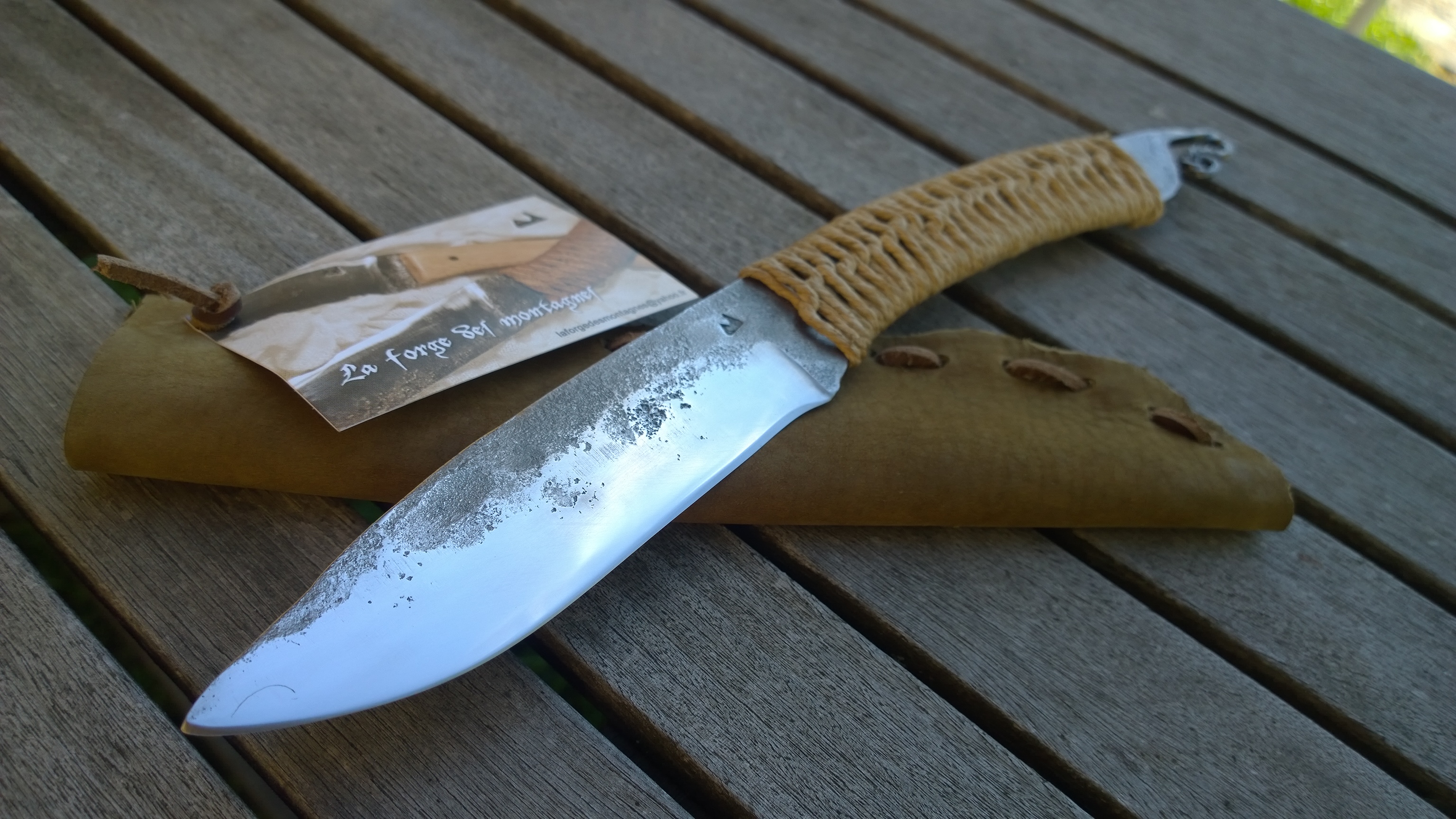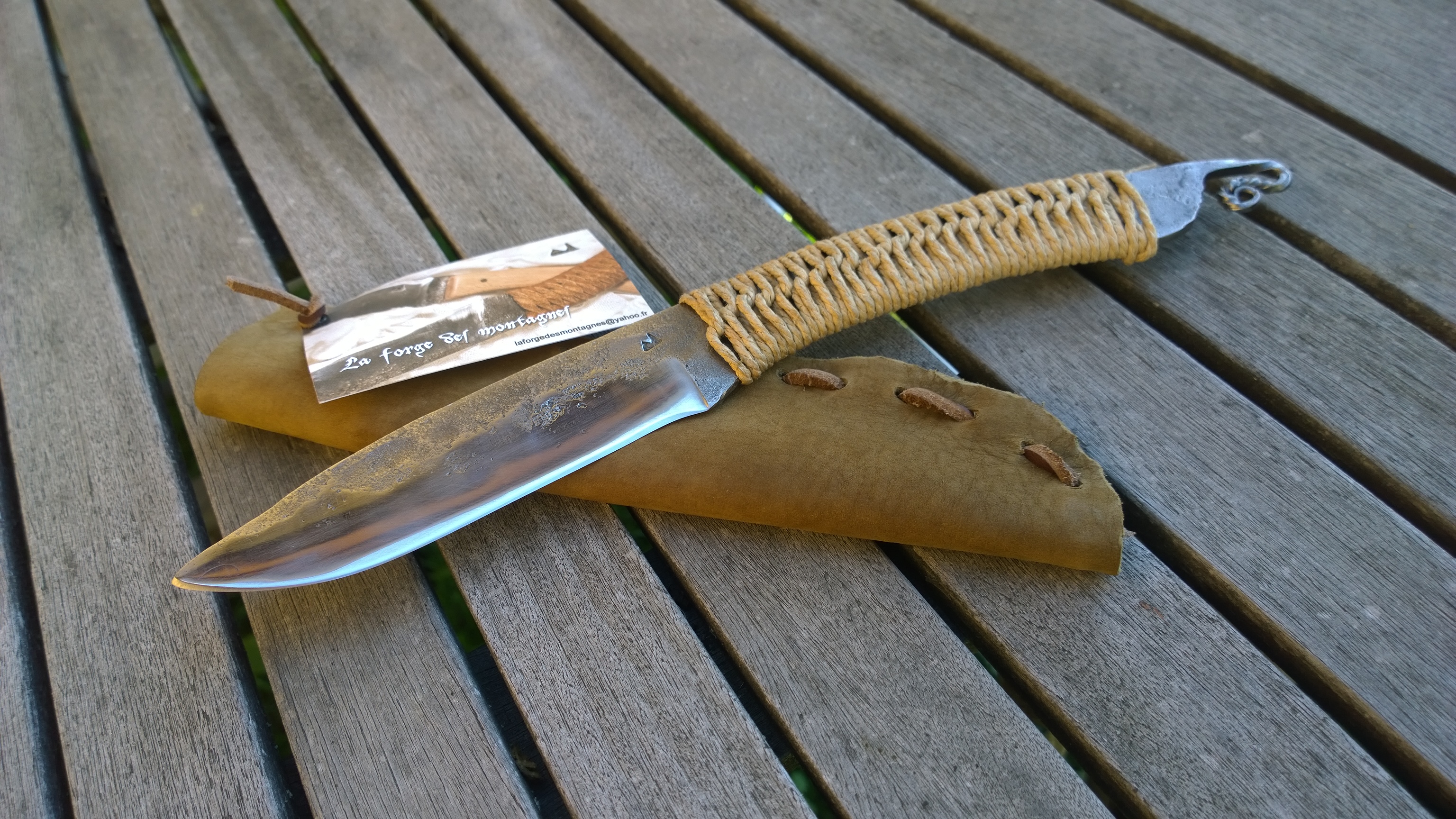 Ce grand couteaux mesure 26cm. La lame est forgée dans l’acier au carbone. Les marques de la forge et le tressage du manche en cordelette lui confèrent son charme primitif et barbare.