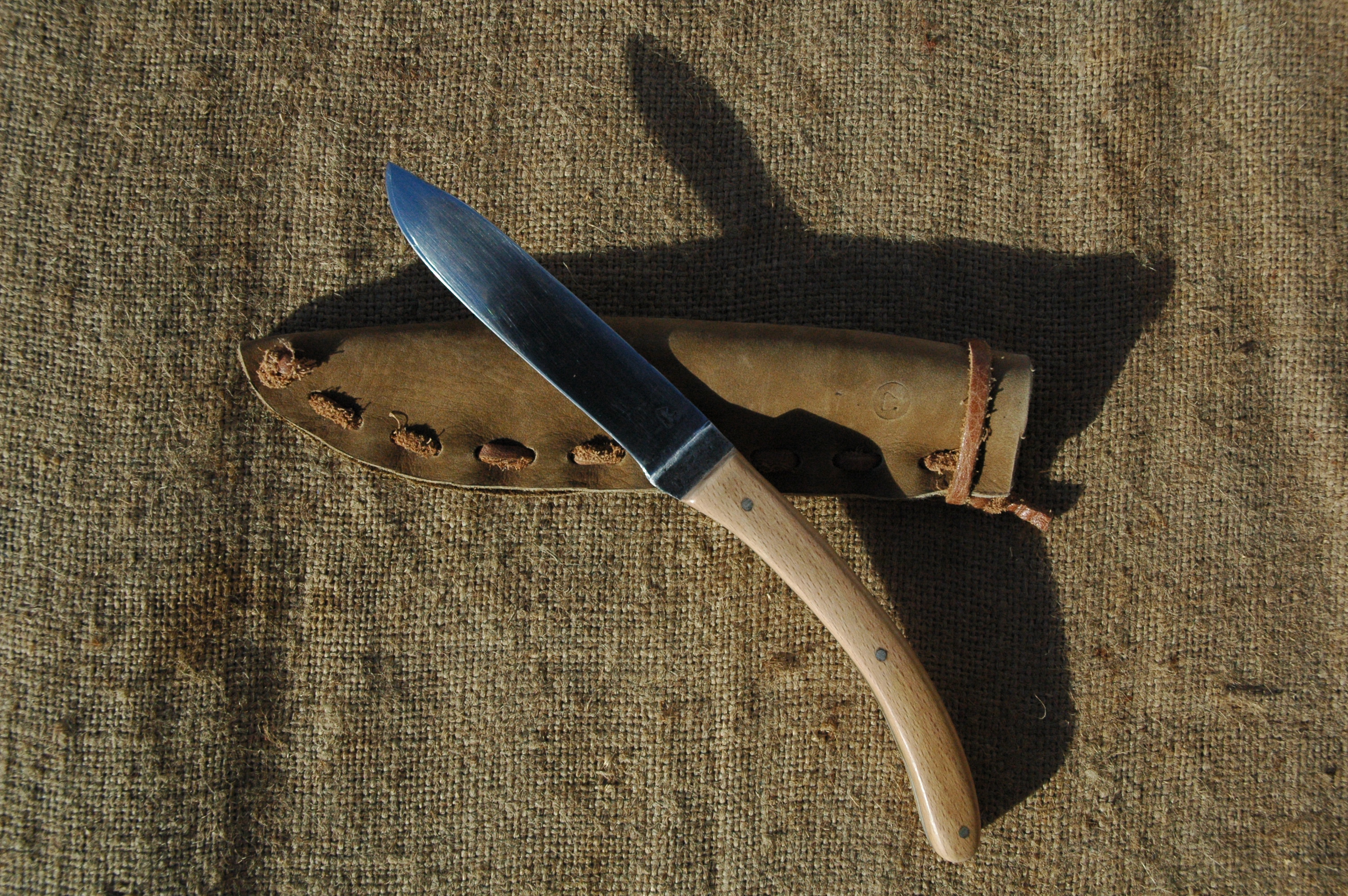 Ce couteau droit 22cm offre une lame finition poli-mirroir. Elle mesure 10cm et présente une partie brut de forge. Le manche est en hêtre riveté. Il est fourni avec son étui en cuir brut.