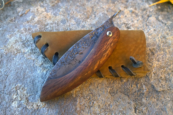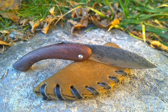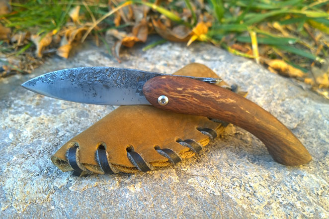 Ce couteau de poche offre une lame large, idéale pour couper et tartiner. Elle garde les marques de la forge. Les volutes naturelles du bois donne l’impression que le manche est enflammé d’un coté et légèrement zébré de l’autre. De petite taille, ce manche est conçu pour les petites mains. Une fois refermé, ce couteau prend l’allure d’un grain de blé.